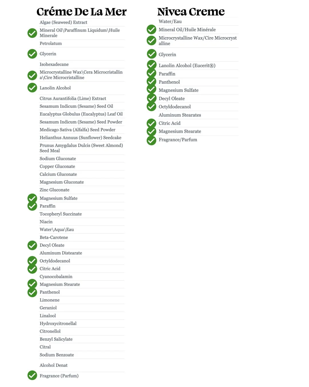 Folk på internettet har i mange år sammenlignet Créme La Mer og Nivea Creme pga. lignende ingredienslister. Den diskusjonen er et godt eksempel på at en ingrediensliste ikke sier alt om en formel. Vi har tatt en titt på detaljene.