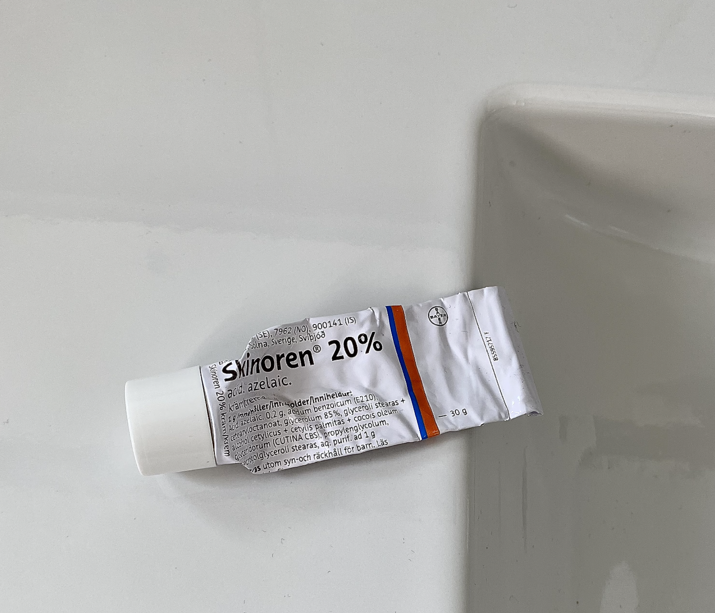 Skinoren, med 20% azelaic acid. Kun tilgjengelig på resept.