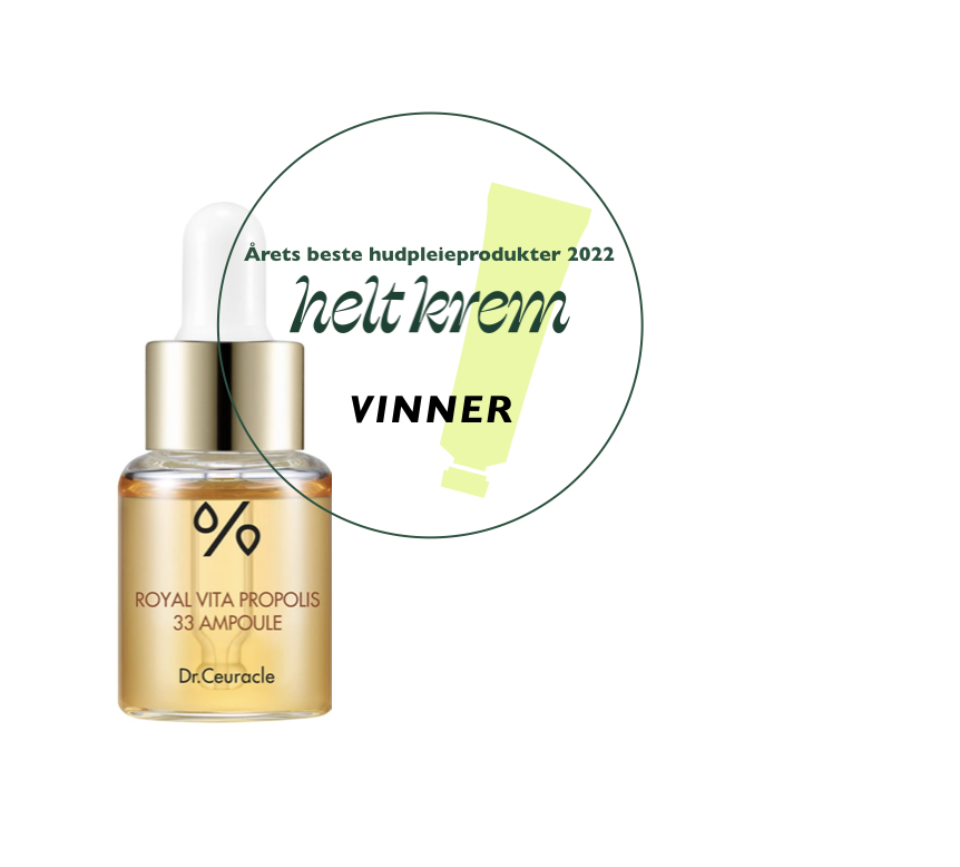 Dr. Ceuracle Royal Vita Propolis 33 Ampoule har en lett gélkonsisens som smelter inn i huden. Det gir masse fukt, i tillegg til å balansere huden og fungerer like godt til tørr og normal hud, som fet og kombinert. Med ingredienser som panthenol, niacinamide, derivat av C-vitamin, centella asiatica og propolis, virker det antibakterielt for å motvirke kviser og sorte prikker, samt fuktighetsgivende og beroligende.