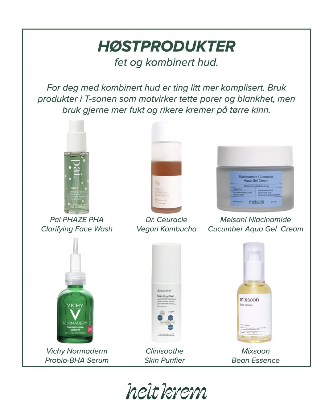 Når temperaturen faller og de fleste av oss ønsker oss ullgenser og en varm kopp te, kan det være på tide å bytte litt på produkter i rutinen. Serum og solkrem er med videre uavhengig av sesong. Når det kommer til rens og fuktighetskrem kan det være lurt å gjøre et bytte til produkter som er milde og gir masse fukt.