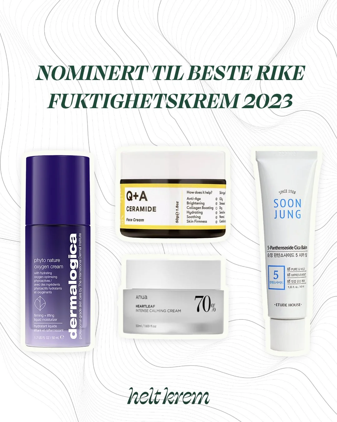 Dette er produkter som toppet listen over rik favorittkrem i fjor og som blir nevnt hyppig av følgere på @heltkrem.no, også i år. Produktene blir ikke en del av avstemningen, for det blir kjedelig å gjenta fjorårets resultat, men disse er altså verdt å merke seg om man leter etter gode, rike kremer, som likes godt av en rekke ulike hudtyper og hudtilstander: