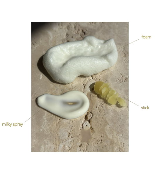 Milky spray i spf 30 eller spf 50 er den praktiske hverdagsversjonen. Rask å påføre, ingen hvit film, og den samme solide filterpakken som skummet. Absorberes raskt og etterlater huden myk og fuktet. Forpakningen er veldig praktisk og minimerer kliss. Formelen inneholder aloe vera, squalane og antioksidanter. Vi har gått igjennom flere slike flasker. Milky spray anbefales! Supergod tekstur.