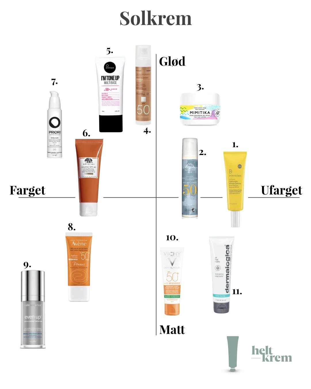 Å finne en favorittsolkrem kan være en evig reise og leting. Her gjør vi et forsøk på å lette prosessen. En liten oversikt over solkremer som kan gi enten glød eller matte ned, jevne ut hudtonen med litt farge, eller gi transparent resultat med ufarget solkrem.
