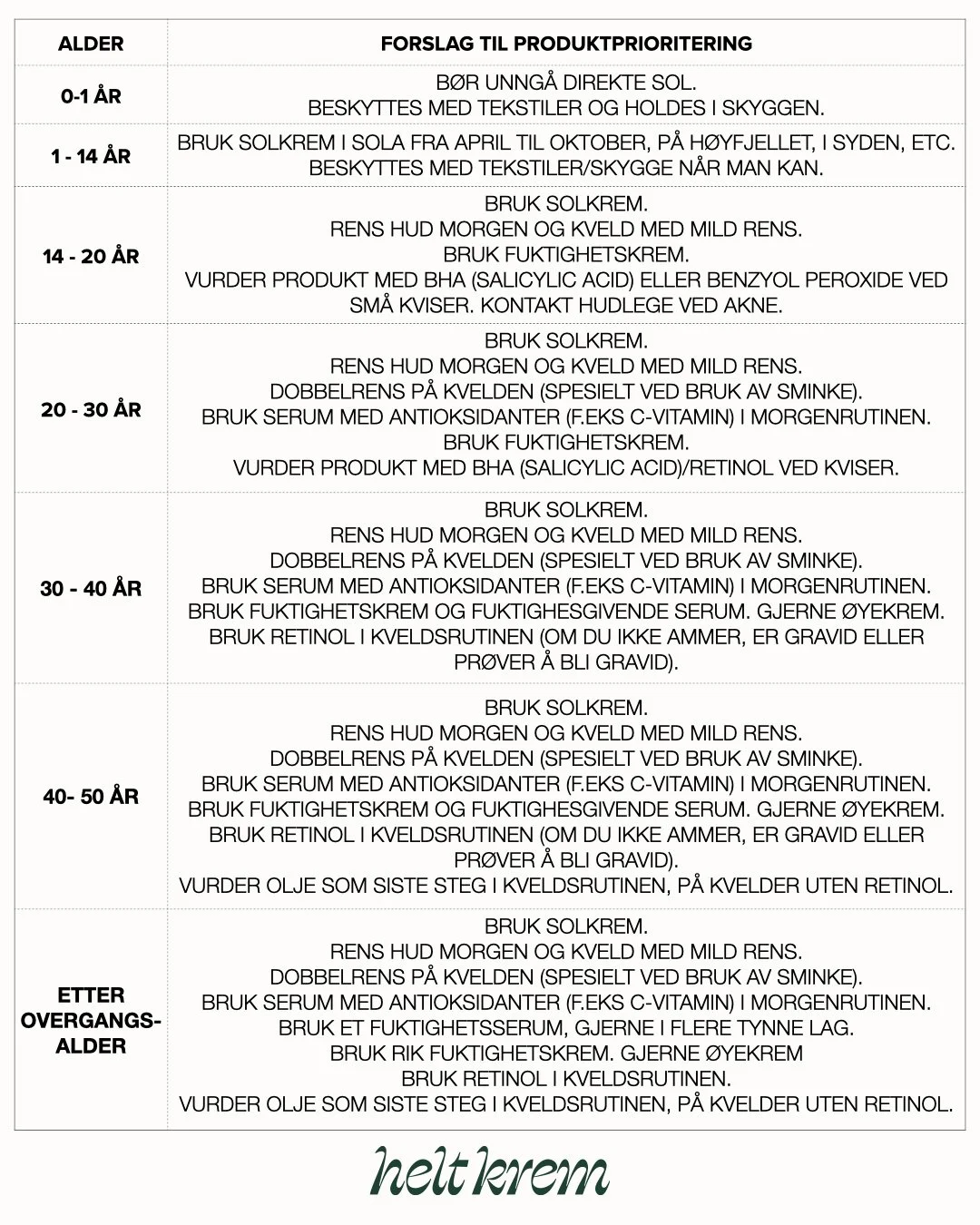Det er mot sin hensikt å bruke retinol, C-vitamin, syrer og andre aktive ingredienser når man er under 18 år. Med mindre man har akne eller tendens til kviser er det ikke noe poeng i seg selv å bruke annet enn solkrem. Her er en liten oversikt over hvordan hudpleie kan prioriteres gjennom livet: