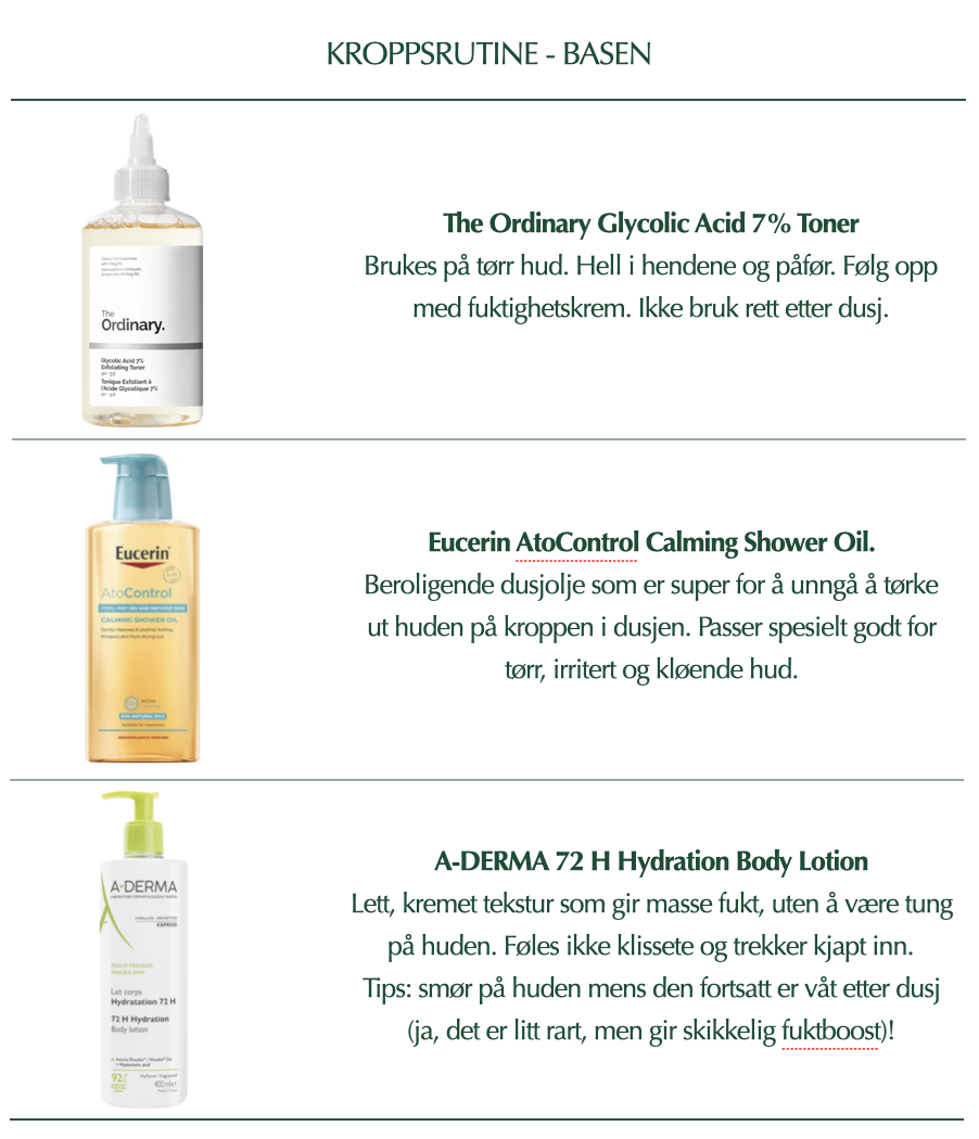 1. Bruk et produkt 2-3 ganger i uken på tørr hud (se produktanbefaling under).