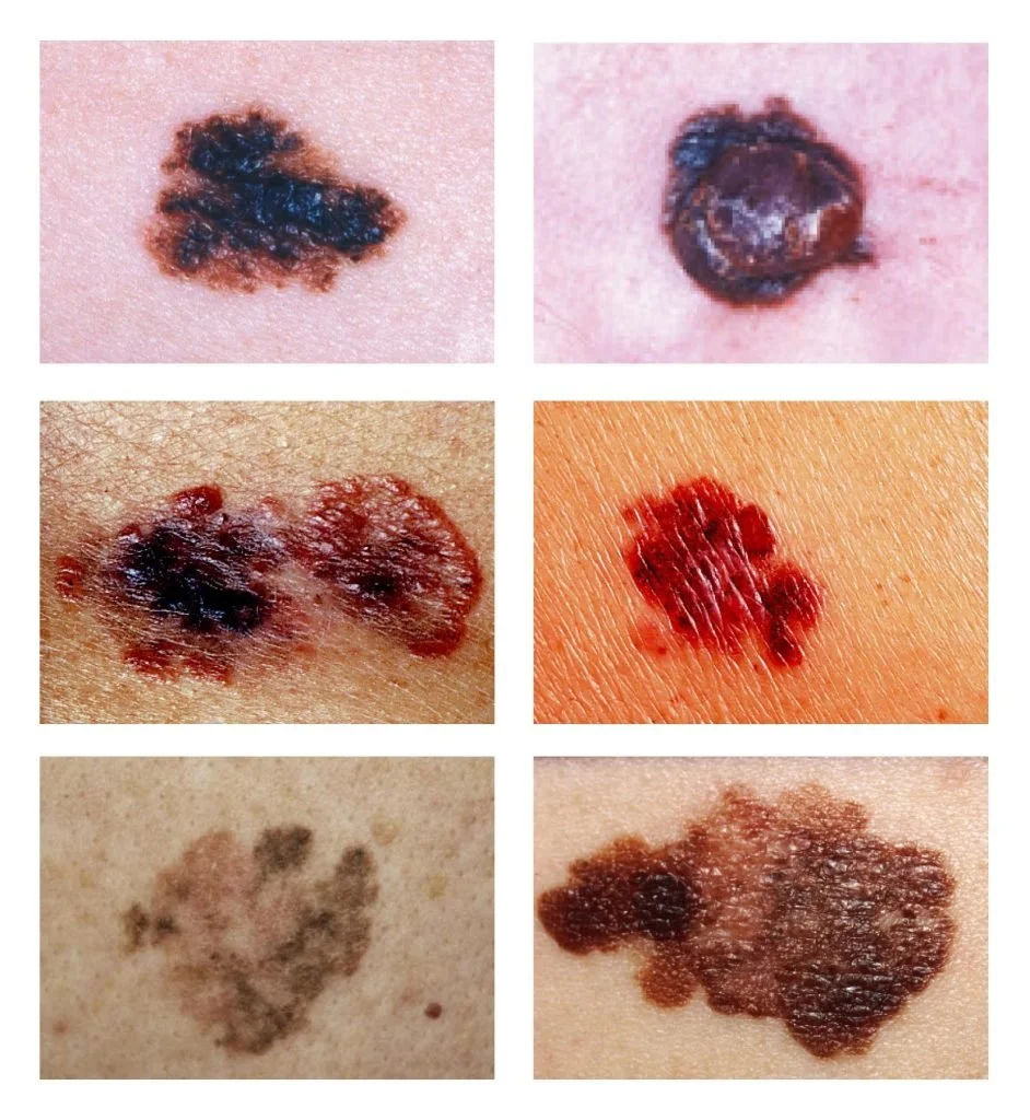 Melanom kan også vises ved sår som ikke gror, rød, irritert hud, som ikke blir bedre, hudfortykkelse, misfargede knuter som vokser, eksemlignende utslett med skorper som faller av og dannes på nytt